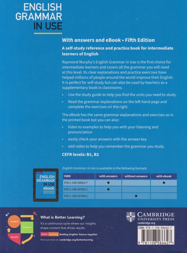 Raymond Murphy’s English Grammar in Use is the first choice for intermediate (B1-B2) learners and covers all the grammar you will need at this level. This book has clear explanations and practice exercises that have helped millions of people around the world improve their English. It also includes an interactive ebook with audio that you can use online or download to your iPad or Android tablet.