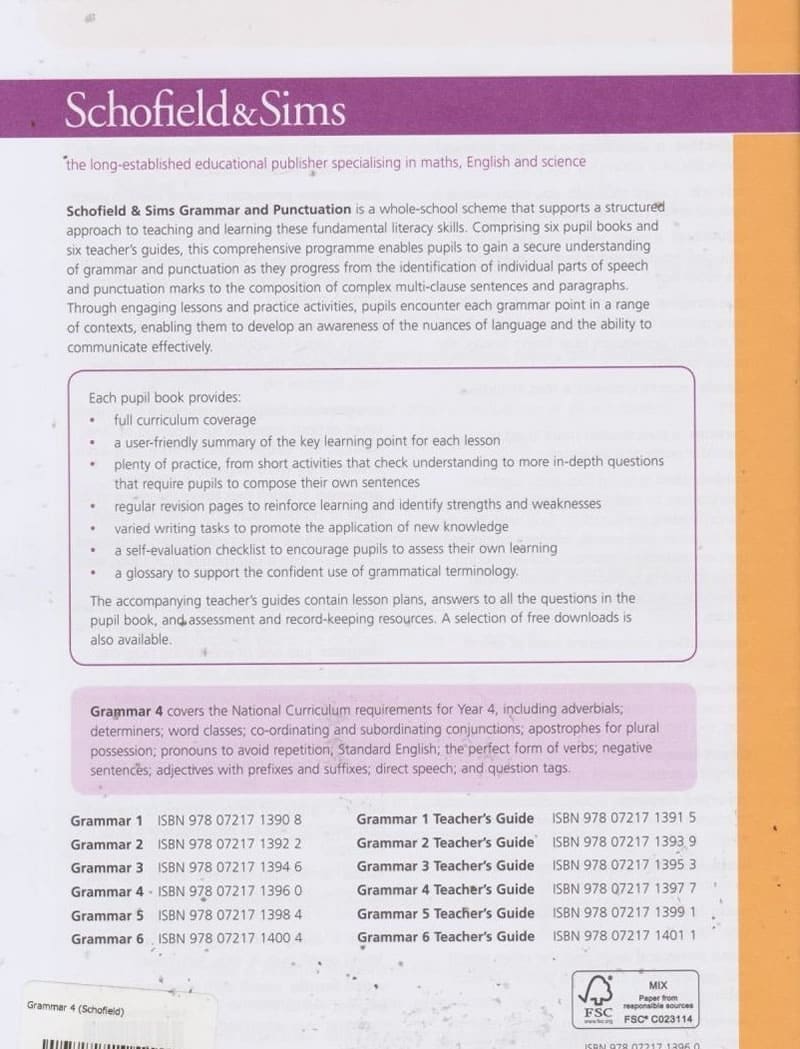 Comprising six pupil books and six accompanying teacher’s guides, one for each primary school year, Schofield & Sims Grammar and Punctuation is a comprehensive programme for teaching grammar and punctuation while also building on vocabulary, reading and writing skills. Through structured lessons, stimulating focus texts and engaging practice activities, children not only learn the correct terminology and usage of grammar and punctuation, but also build up the skills, knowledge and confidence to apply them successfully in their own writing. The Grammar 4 pupil book contains 30 single-page lessons and covers the National Curriculum requirements for Year 4. Featured topics include adverbials; determiners; word classes; co-ordinating and subordinating conjunctions; apostrophes for plural possession; pronouns to avoid repetition; Standard English; the perfect form of verbs; negative sentences; adjectives with prefixes and suffixes; direct speech; and question tags. Each pupil book practice page includes a concise summary of the key learning point for each lesson, followed by two short ‘Try it’ exercises and a ‘Sentence practice’ activity. Regular ‘Revision’ pages reinforce learning, while imaginative ‘Writing tasks’ allow children to ‘show off’ their grammar and punctuation skills in a more formal context. Additional features provided at the back of the book include a glossary to support the confident use of grammatical terminology and a self-evaluation checklist to strengthen understanding and encourage pupils to assess their own learning. A separate accompanying teacher’s guide, Grammar 4 Teacher’s Guide (ISBN 9780721713977), contains lesson plans, answers to all the questions in the pupil book, and assessment and record-keeping resources.
