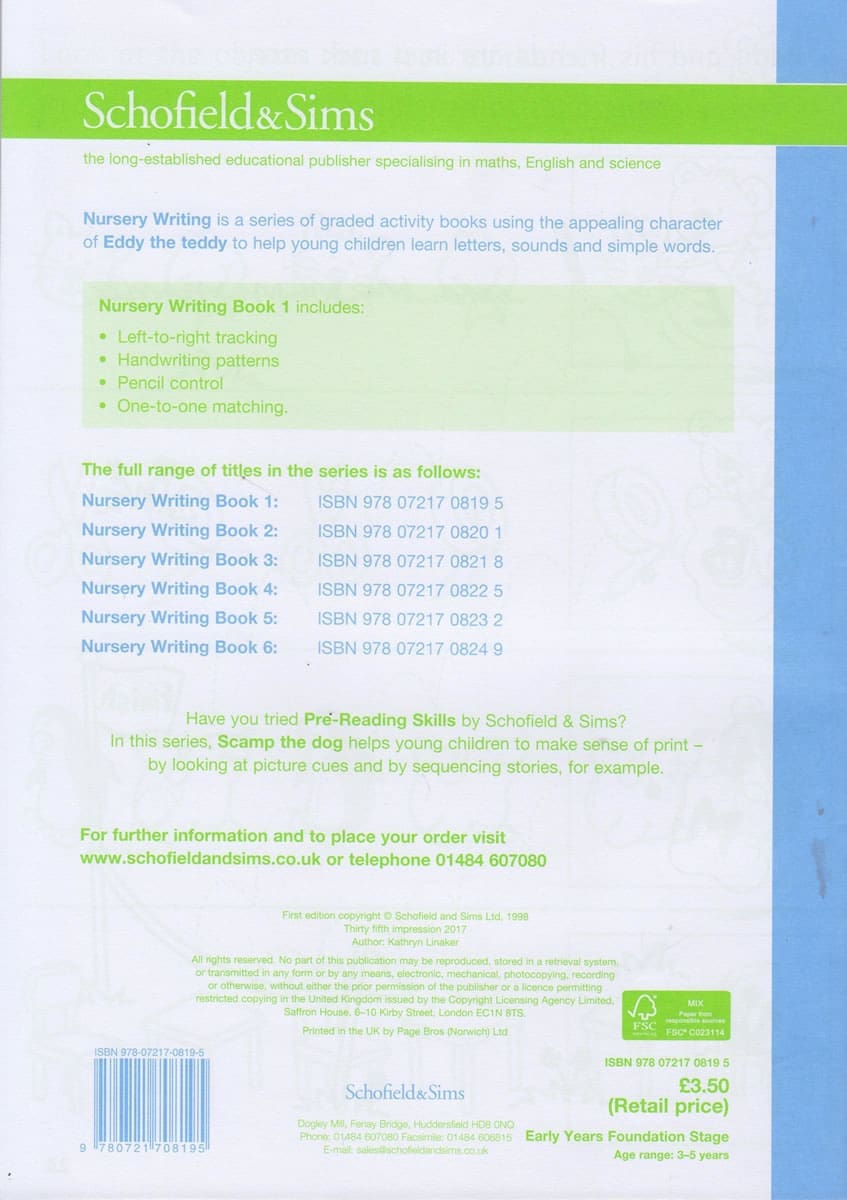 Nursery Writing is a series of graded activity books using the appealing character of Eddy the teddy to help young children learn letters, sounds and simple words. Book 1 includes: